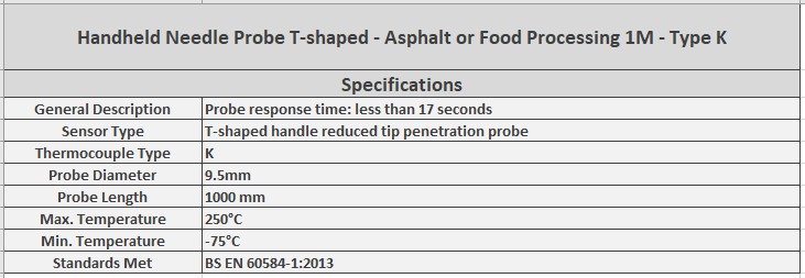 - Handheld Needle Probe T-shaped - Asphalt or Food Processing 1M - Type K