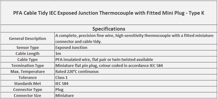 - PFA Cable Tidy IEC Exposed Junction Thermocouple with Fitted Mini Plug - Type K