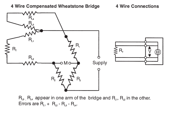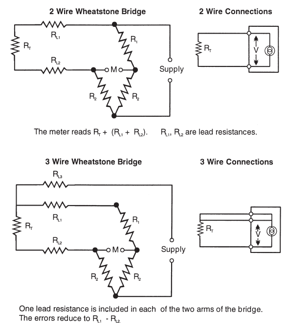 This is usually accomplished by connecting the lead wires into the modified WHEATSTONE BRIDGE circuit in the measuring instrumentation. The lead wires for a RTD temperature sensor can be 2,3 or 4 in number, often dependent upon the requirements of the instrumentation and/or the overall accuracy required. Two leads are adequate for some industrial applications, three leads compensating for lead resistance improves accuracy, and for the highest accuracy requirements four leads are required, in a current/voltage measuring mode. Typical bridge circuits for 2, 3 and 4 lead thermometers are shown below: