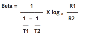 where T1 and T2 are two specified temperatures, usually 273.15K (0°C) and 323.15K (50°C), and R1 over R2 is the ratio of the measured resistance at the two specified temperatures. Beta is expressed in degrees Kelvin.
